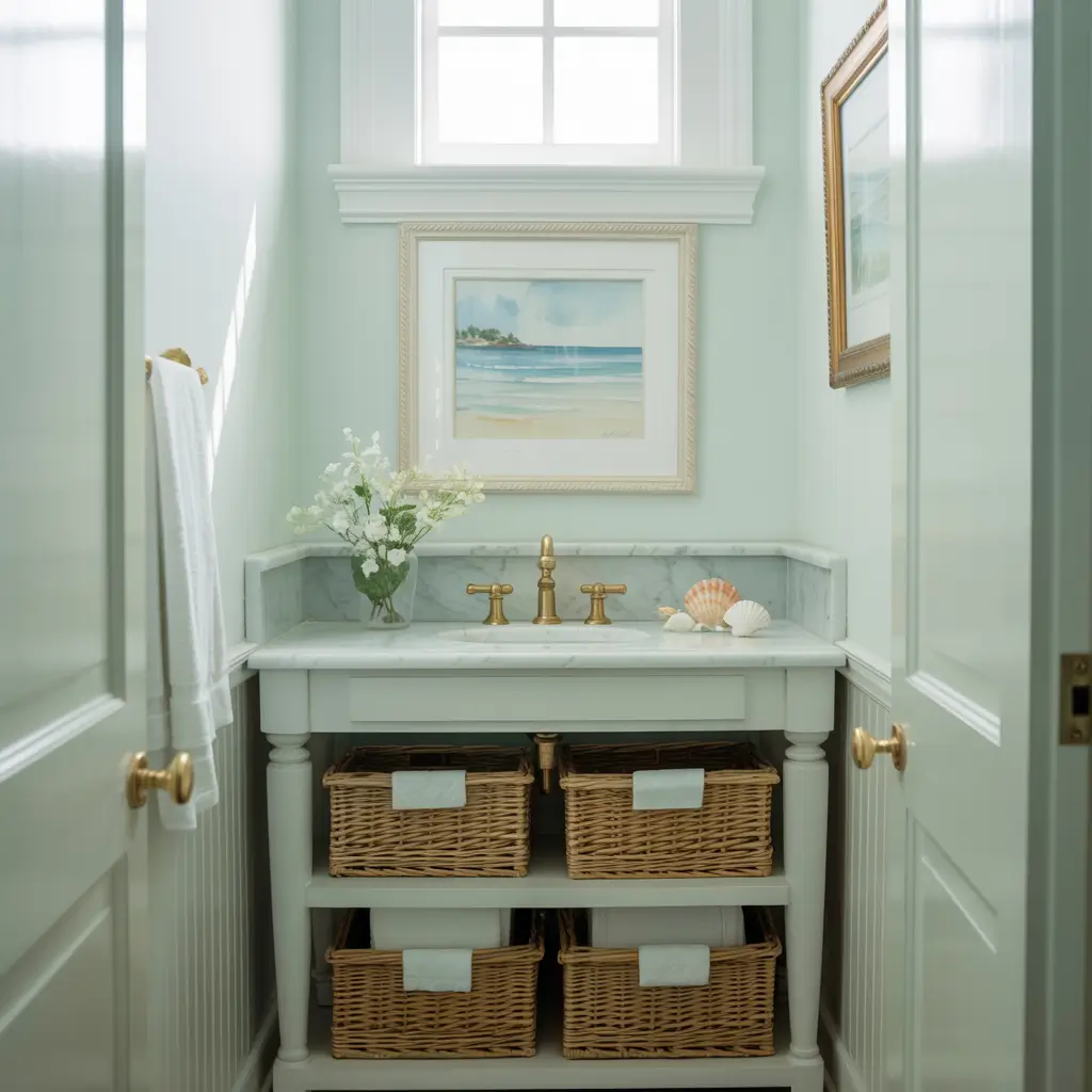 Small powder rooms actually benefit from coastal design because the style naturally maximizes light and space. My tiny powder room went from dungeon-dark to beach-bright with just a few strategic changes.
