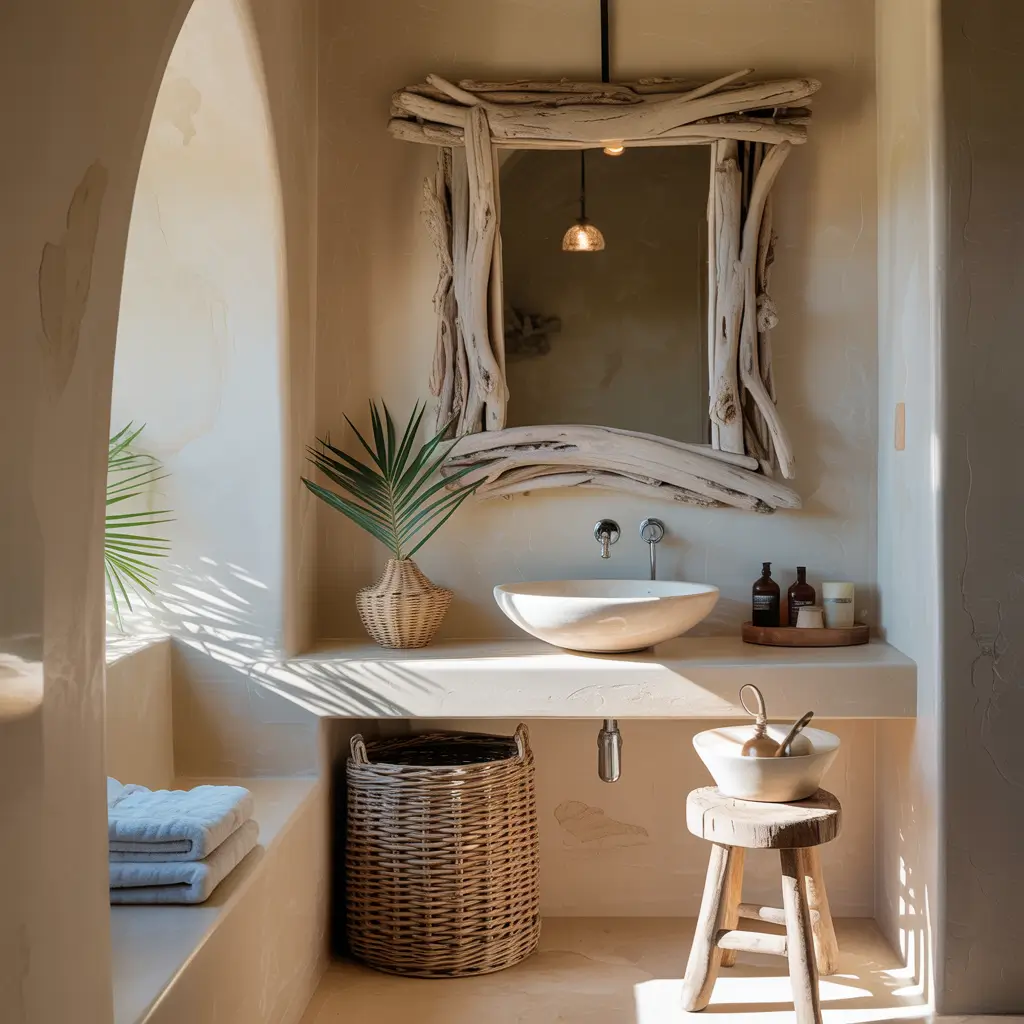My driftwood obsession started with one piece I found on vacation. Now I incorporate it everywhere – a driftwood-framed mirror, hooks made from beach finds, even a DIY toilet paper holder. Rattan baskets hide all my bathroom clutter while looking decorative.