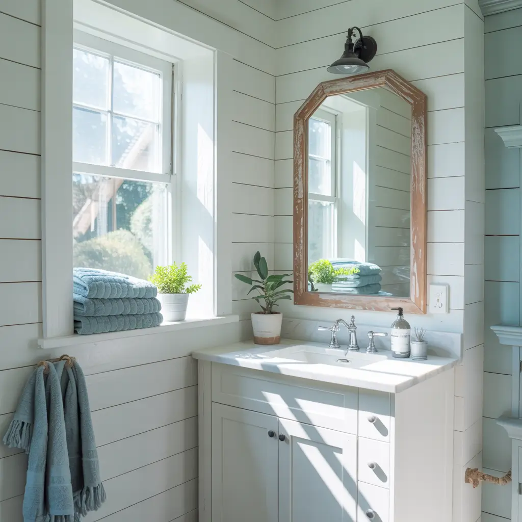Let’s talk about shiplap – the MVP of coastal bathroom walls. This isn’t just about jumping on the Joanna Gaines bandwagon (though she knows what’s up). Horizontal lines literally make small bathrooms look wider.