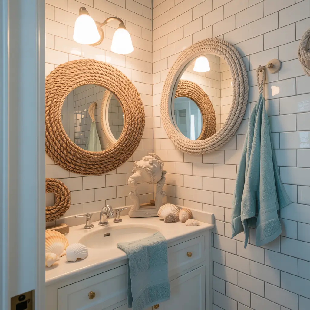 I splurged on a rope-wrapped mirror and nautical sconces, and honestly? Best bathroom investment ever. The rope adds texture while the brass fixtures catch light beautifully. Together, they create this warm, beachy glow that makes everyone look good.