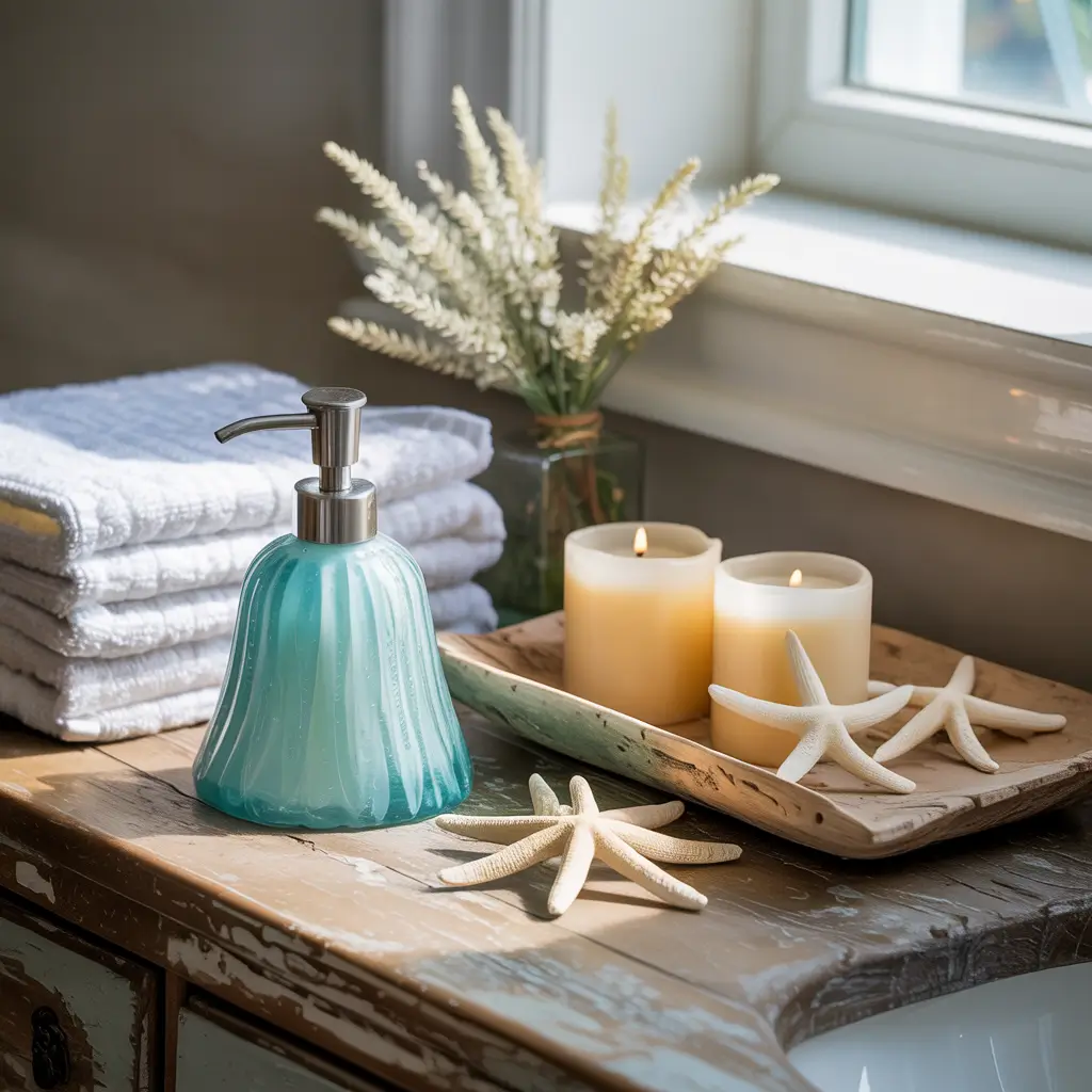 Stick to accessories that could realistically exist in a beach house. Think Turkish towels in ocean hues, glass soap dispensers that look like vintage bottles, and natural sponges displayed in wire baskets. These items feel purposeful, not purely decorative.