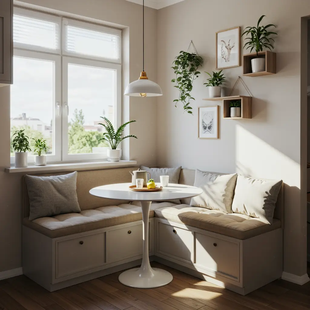 Corner nooks work by pushing seating into the corner, maximizing floor space in the center of the room. You can buy pre-made nook sets or DIY with a corner bench and separate table.