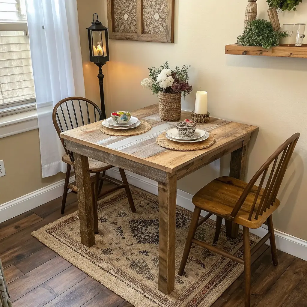 Rustic wooden tables bring warmth to small spaces without overwhelming them. There’s something about natural wood grain that makes even the tiniest dining area feel homey and welcoming. Plus, they hide crimes against furniture better than any other material.