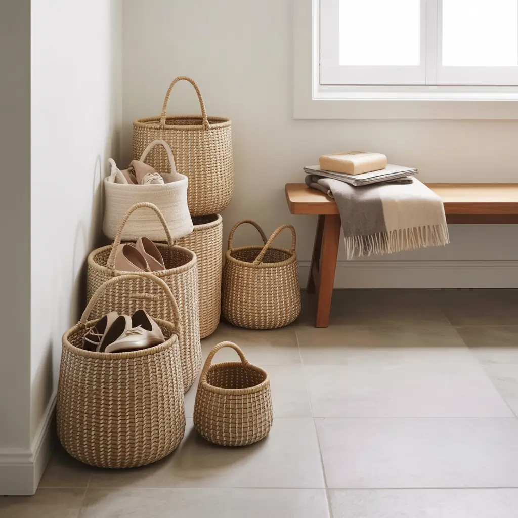 Baskets are the unsung heroes of entryway organization. They corral clutter while looking intentionally decorative. The key is choosing baskets that look good even when they’re doing the dirty work of storage.