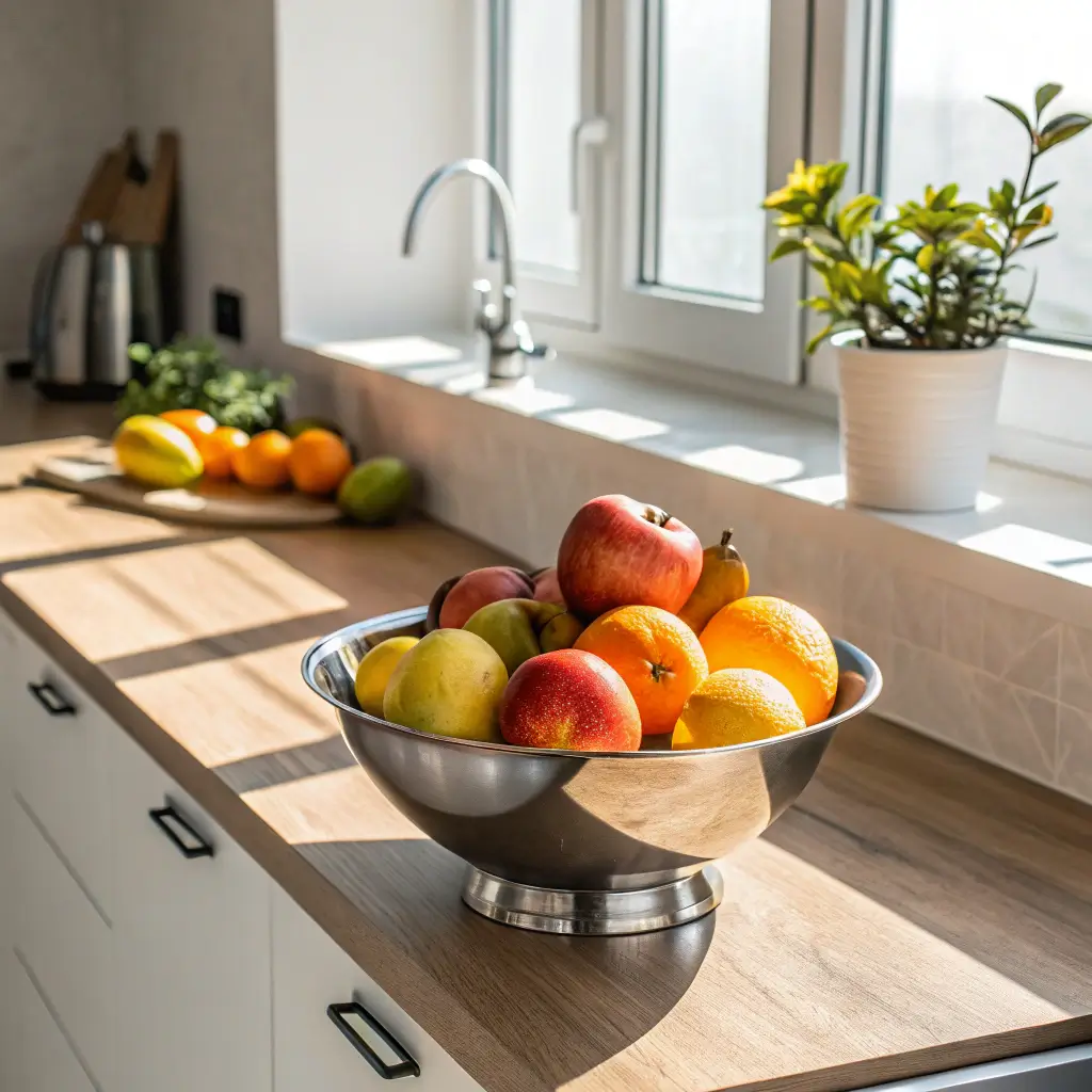 Keep your fruit bowl simple—overflowing fruit baskets eat up visual and physical space. 5-7 pieces of fruit maximum looks abundant without overwhelming.