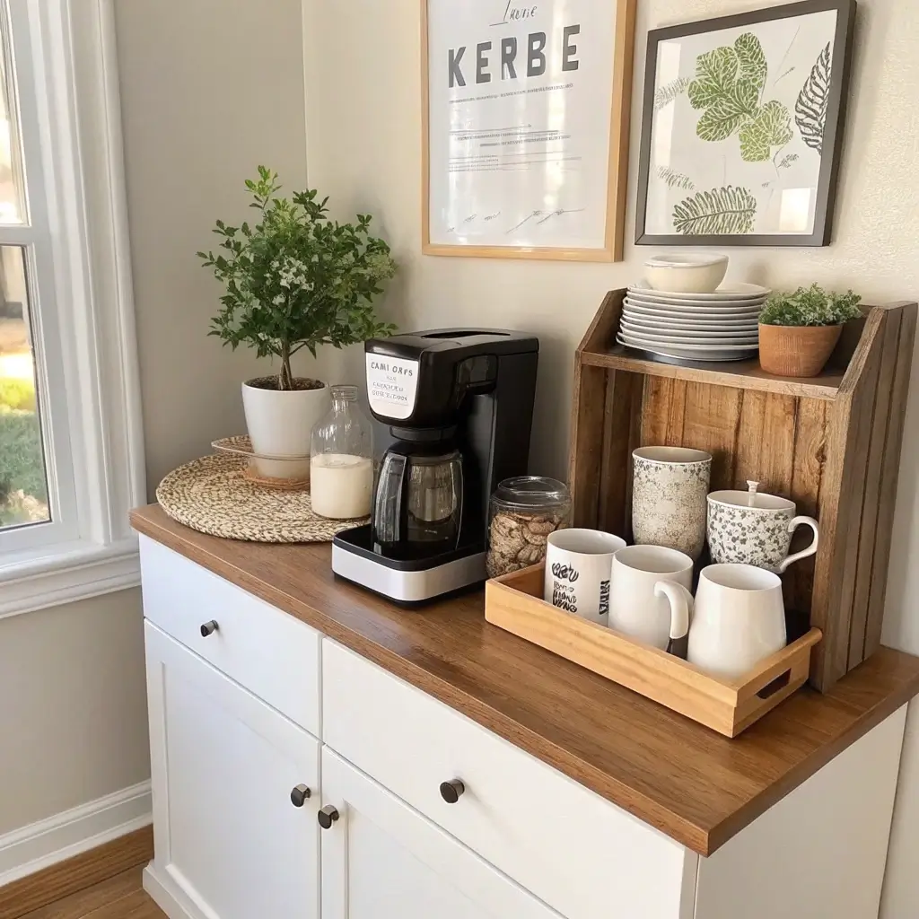My coffee corner lives on a small wooden tray with my espresso machine, two mugs hanging on Command hooks above it, and one canister for beans. It takes up maybe 12 inches but looks like a legit coffee bar. The tray trick makes it feel designed rather than thrown together.