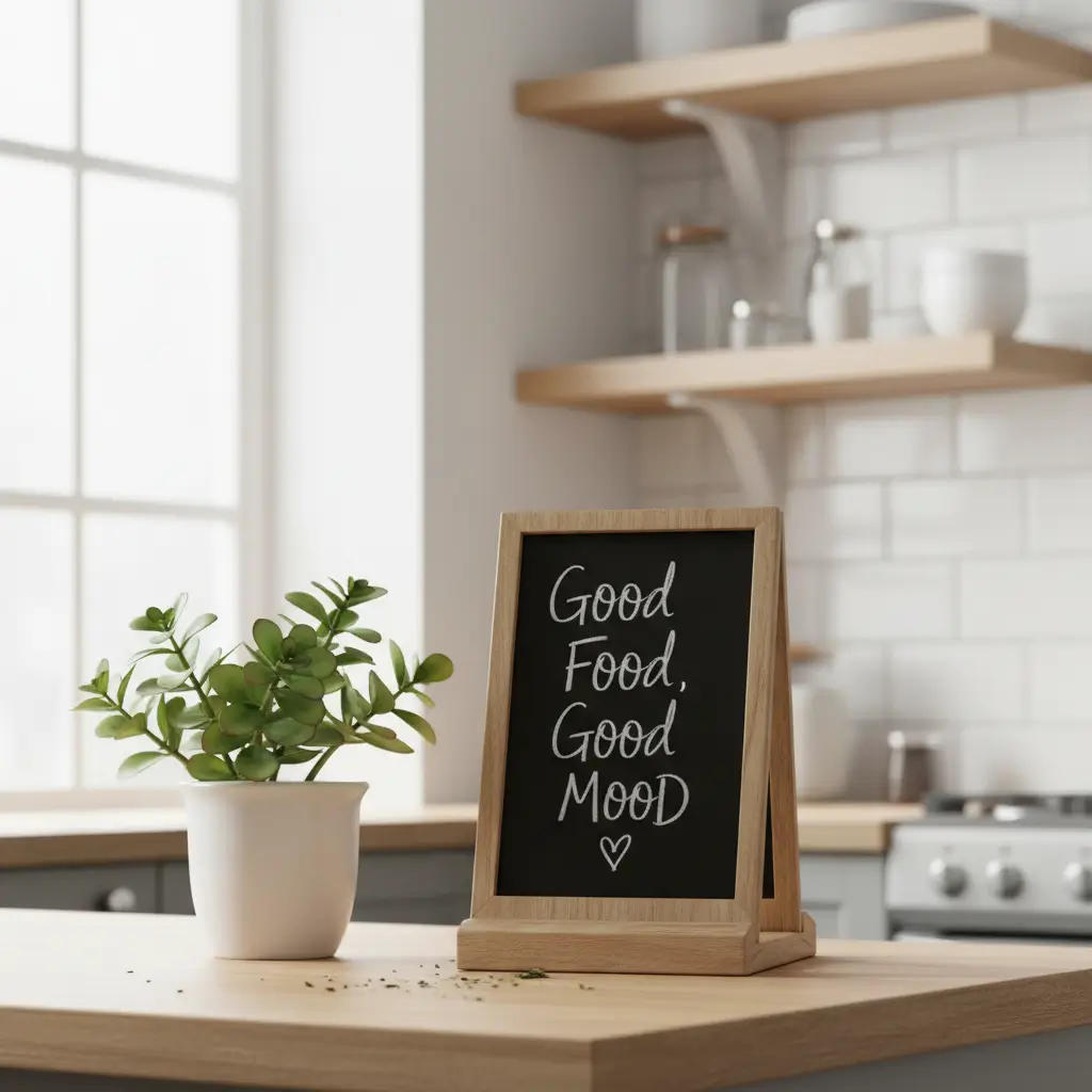 A small chalkboard adds personality and changeable decor without permanent commitment. You can update it with menus, quotes, or grocery lists.