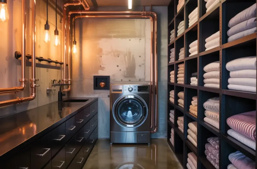 Industrial design brings urban edge to even the tiniest laundry nook. Black iron pipes and reclaimed wood create sturdy, stylish storage that looks like it means business.