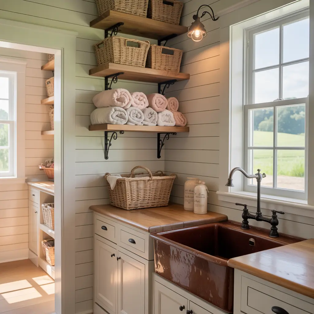 Start with shiplap walls (or faux shiplap if you’re budget-conscious like me). Add vintage-style metal baskets, mason jar storage, and maybe a cute “Laundry Today or Naked Tomorrow” sign. Yes, it’s basic, but who cares when it looks this good?