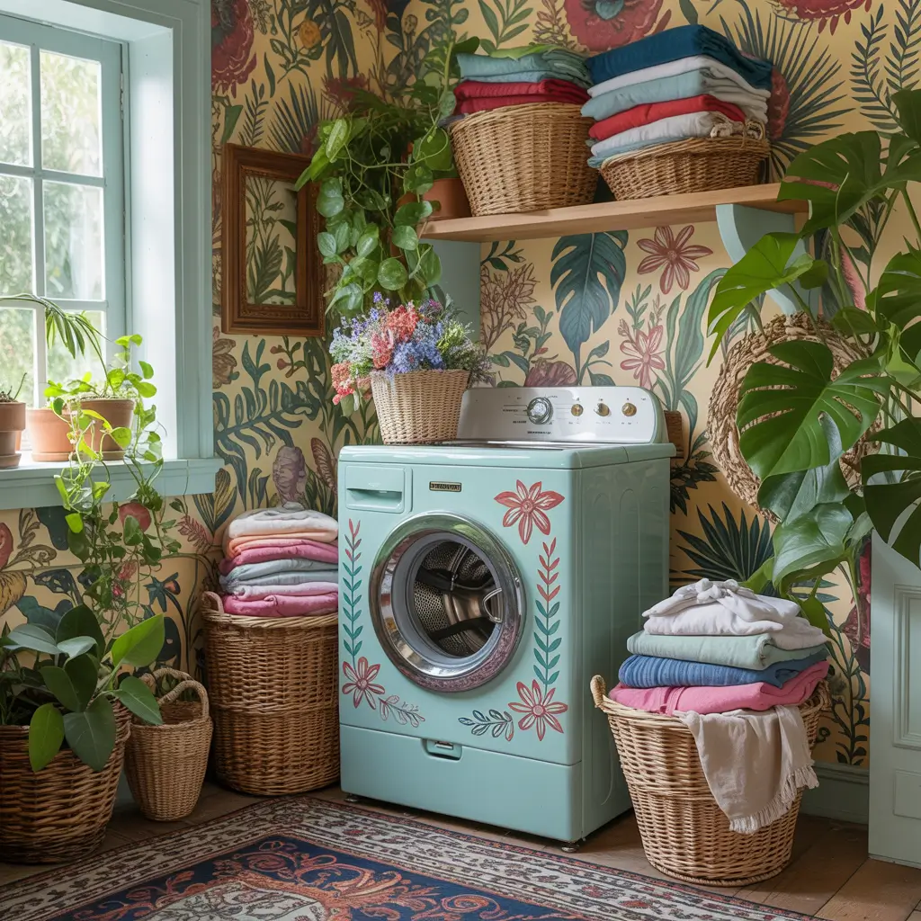 Transform your laundry corner with macramé wall hangings, woven baskets, and earthy color palettes. Throw in some pampas grass and suddenly you’re not doing laundry; you’re having a spiritual experience. Sort of.