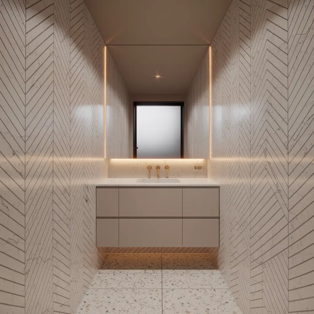 Want to really nail this look? Carry the marble pattern from your floor right up one wall. I call this the “waterfall effect,” and it draws the eye upward, making your ceilings look higher than they actually are. Pro tip: if you’re using marble-look tiles, book-match them (arrange them so the veining creates a mirror image) for that authentic luxury feel.