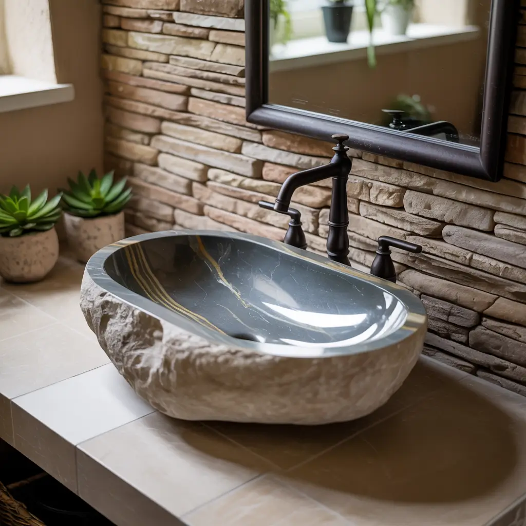 Consider a single stone accent wall or just a stone vanity top. I used a live-edge wood vanity with a river rock backsplash in my powder room, and it brings this incredible earthy elegance without breaking the bank.