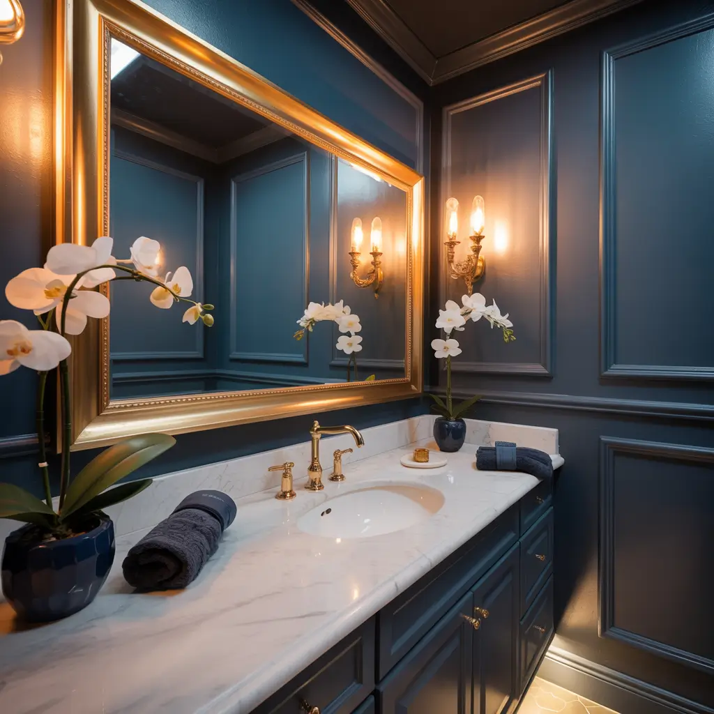 The trick with navy walls in small bathrooms? Balance them with plenty of light sources: