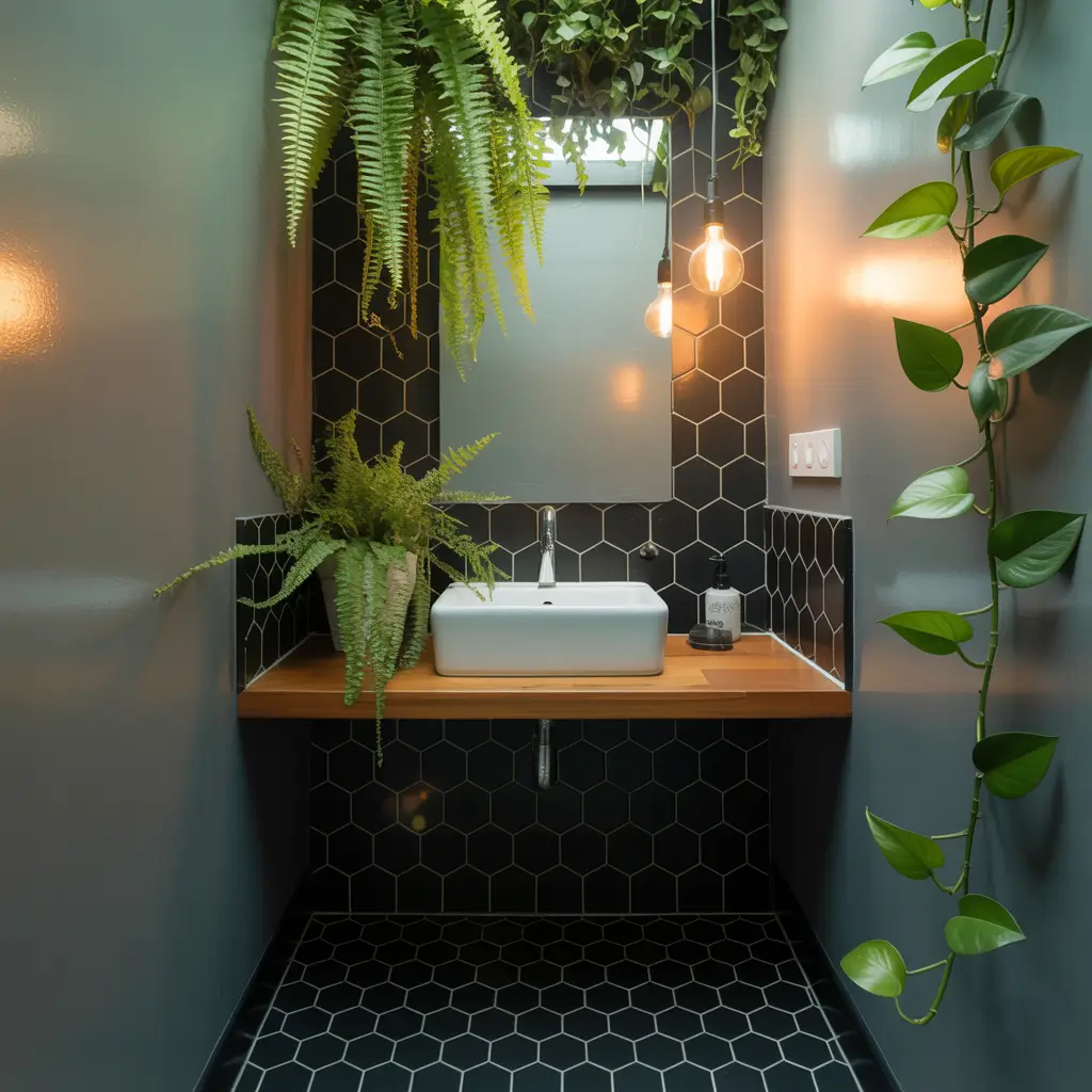 Black hexagon tiles give me life! The geometric pattern adds movement while black keeps things moody. Throw in some plants and you’ve got this whole urban jungle meets gothic romance situation happening.