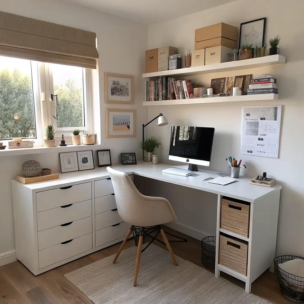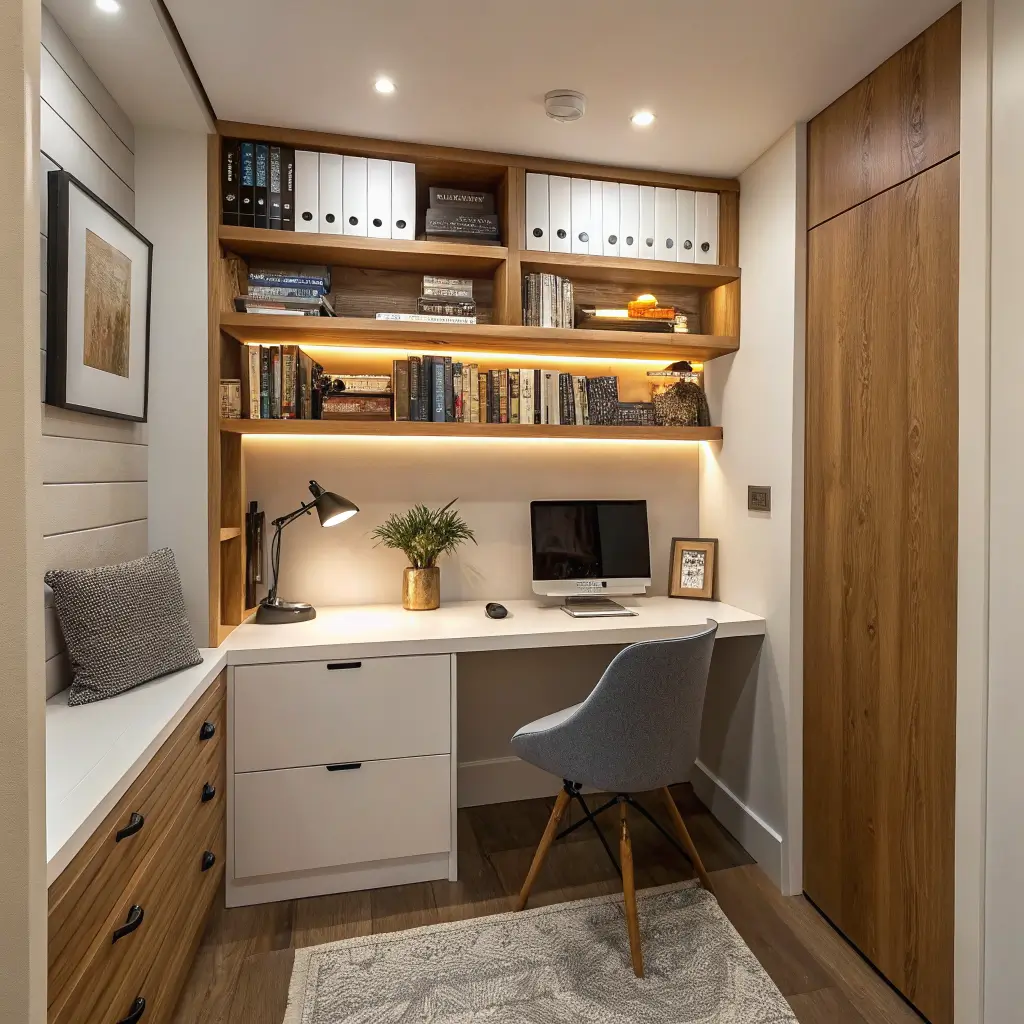 Built-in shelves transformed my awkward alcove into a Pinterest-worthy micro office. That weird indent in your wall that serves no purpose? Perfect spot for a custom shelving unit with an integrated desk.