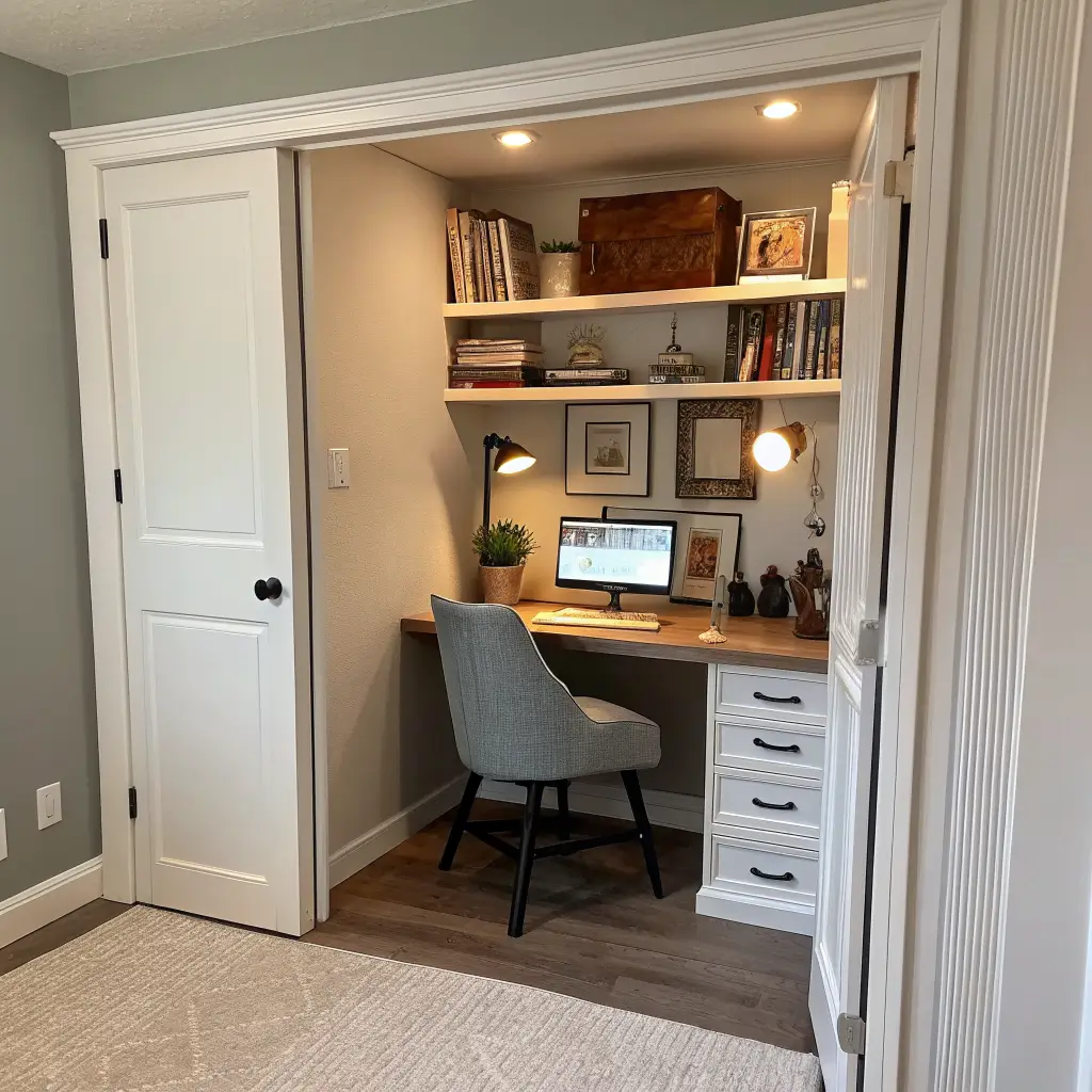 Turning a closet into an office sounds crazy until you realize closets are basically pre-built alcoves begging for purpose. My friend called this idea ridiculous until she saw my “cloffice” (closet + office) and immediately went home to empty her own closet.