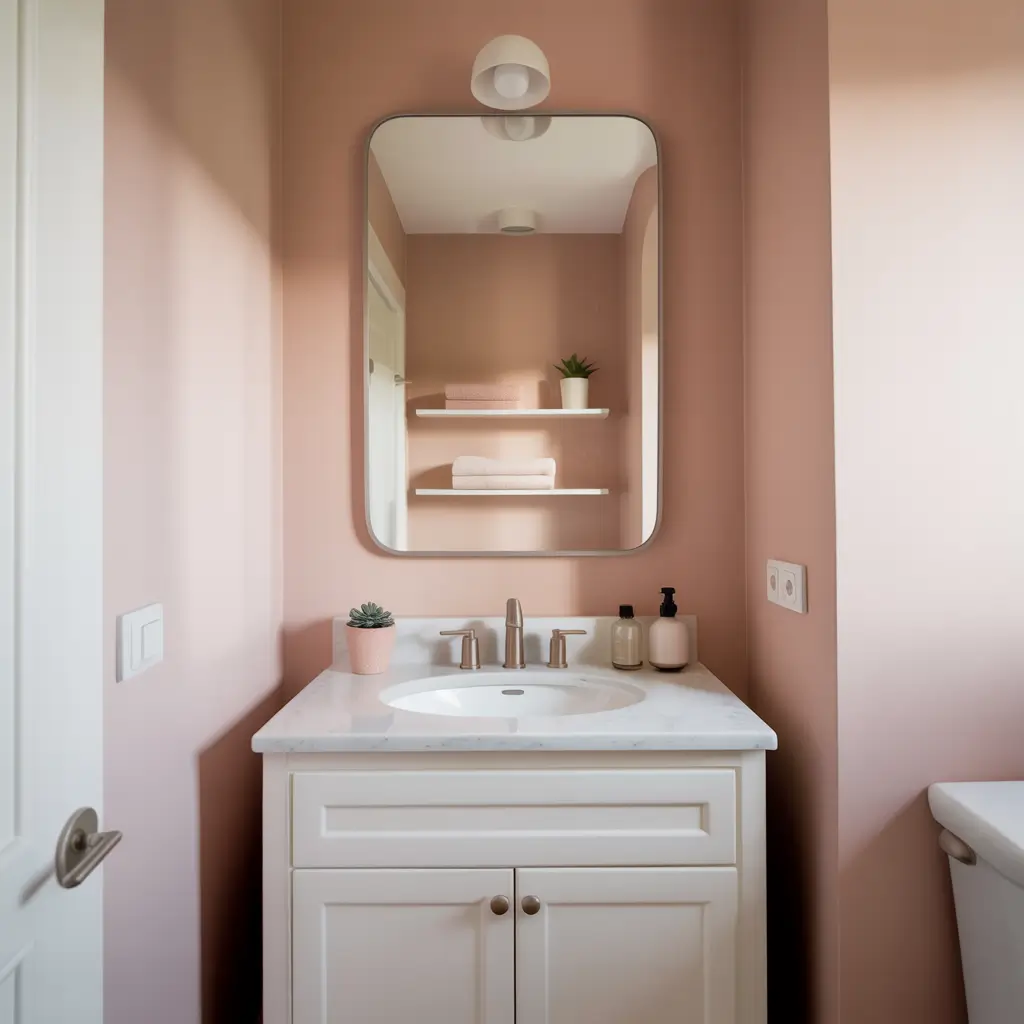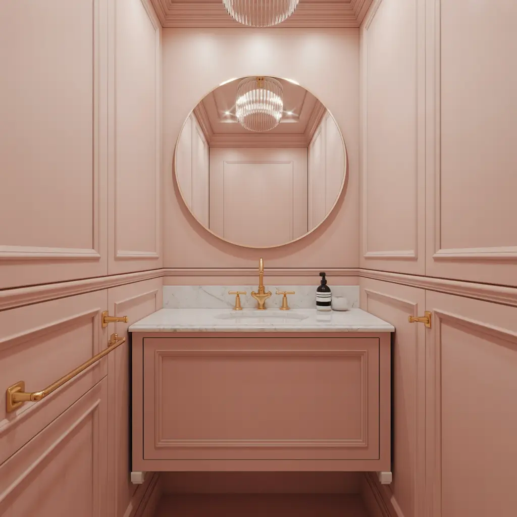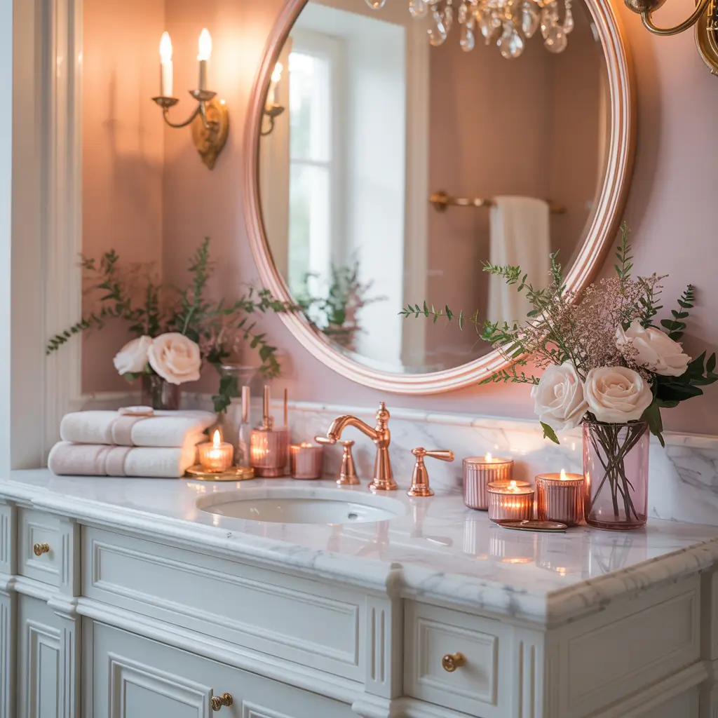 The rose gold comes through in your fixtures—faucets, towel bars, mirror frames. The pink provides the backdrop, whether through paint, tiles, or accessories. Together? Magic happens.