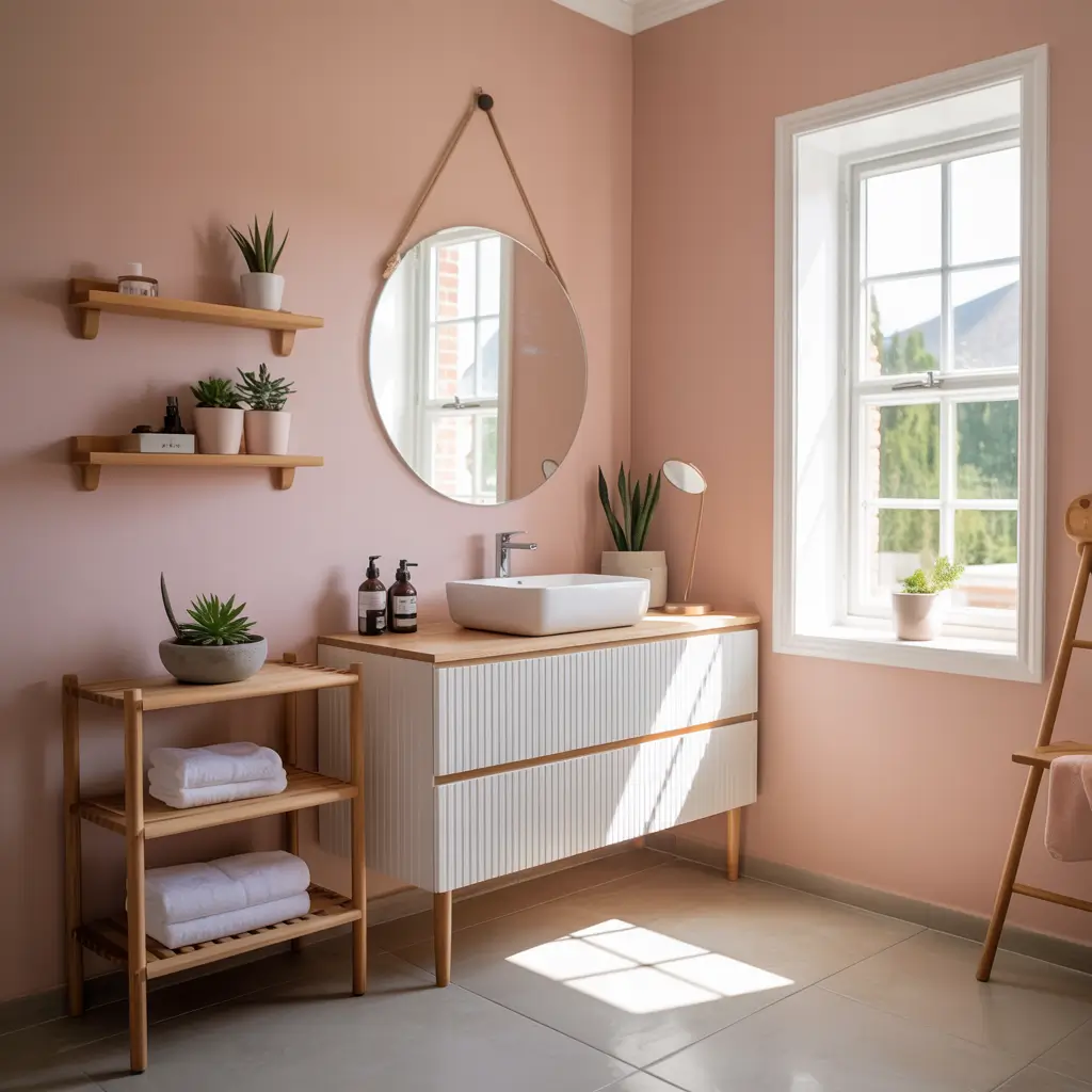 We’re talking natural wood, clean lines, and just enough pink to warm things up without disrupting that minimalist Scandi flow. Think of it as adding a sunset filter to your bathroom—everything just looks better.