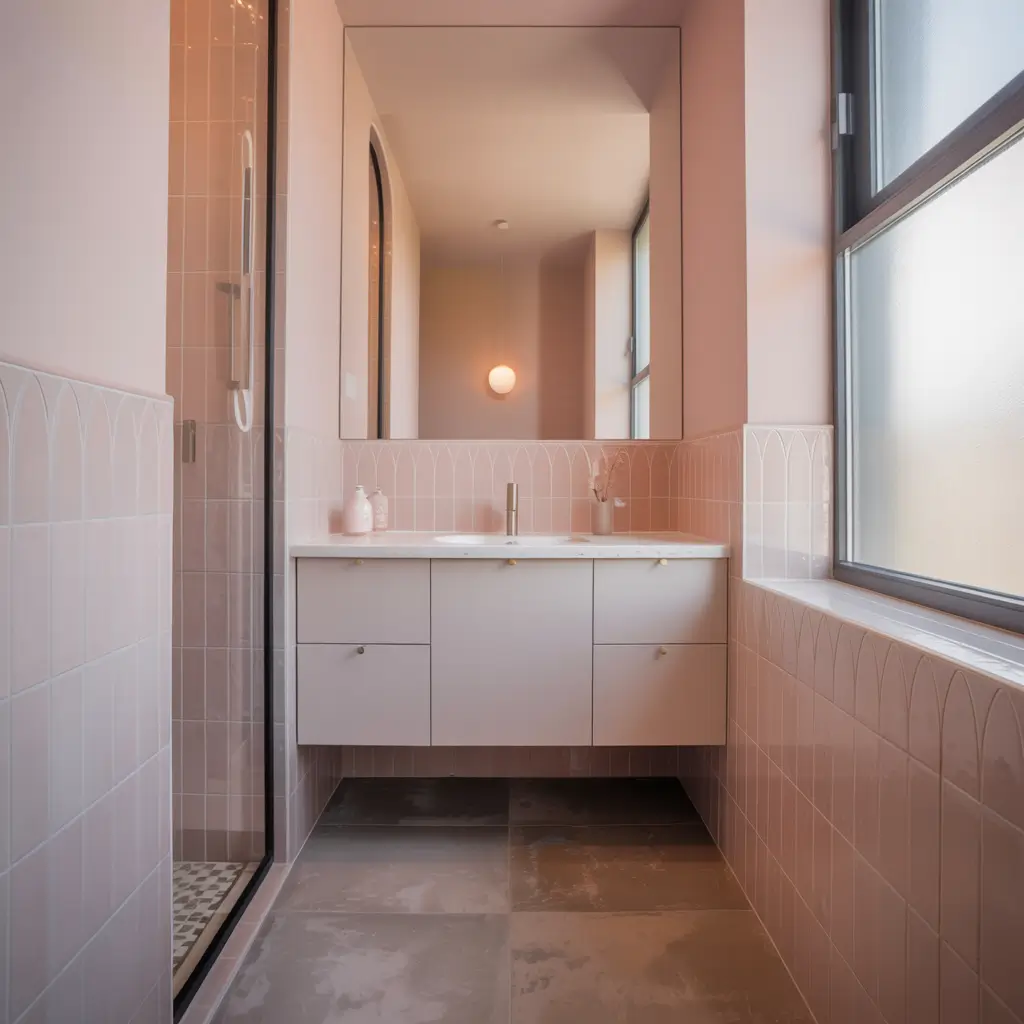 Modern doesn’t mean boring. We’re talking floating vanities, frameless glass shower doors, and geometric patterns that keep things interesting. The pink here acts as a softening agent—like adding milk to your coffee.