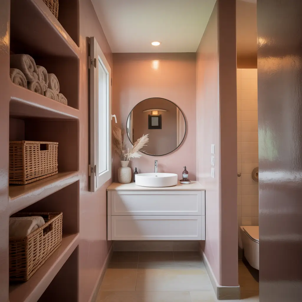 Small bathroom, big storage needs—the eternal struggle. But pink can actually help here. Light pink walls make the space feel larger, while smart storage keeps clutter from ruining your pretty pink paradise.