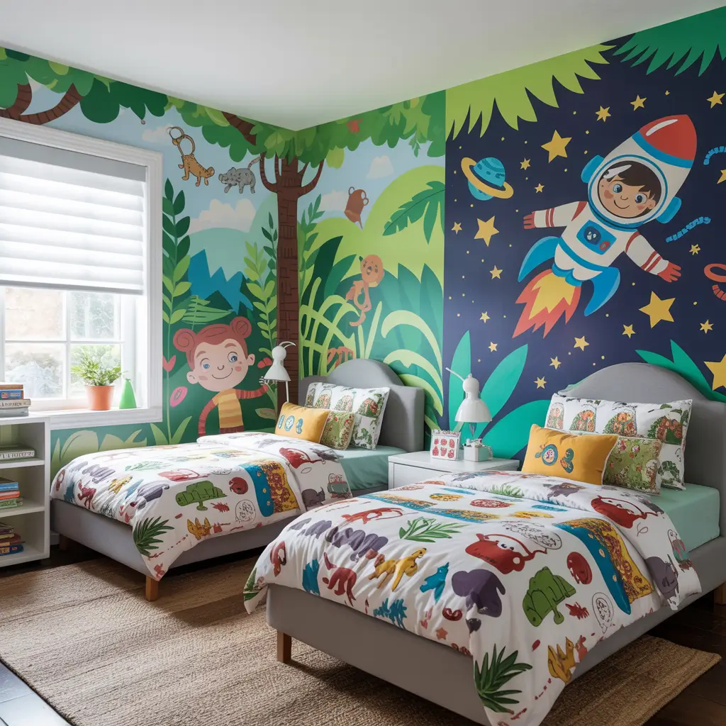 My friend’s kids have opposite walls themed completely differently – one has a galaxy mural, the other has a jungle scene. The connecting walls? Neutral white to balance the chaos. It sounds crazy, but it actually works beautifully.