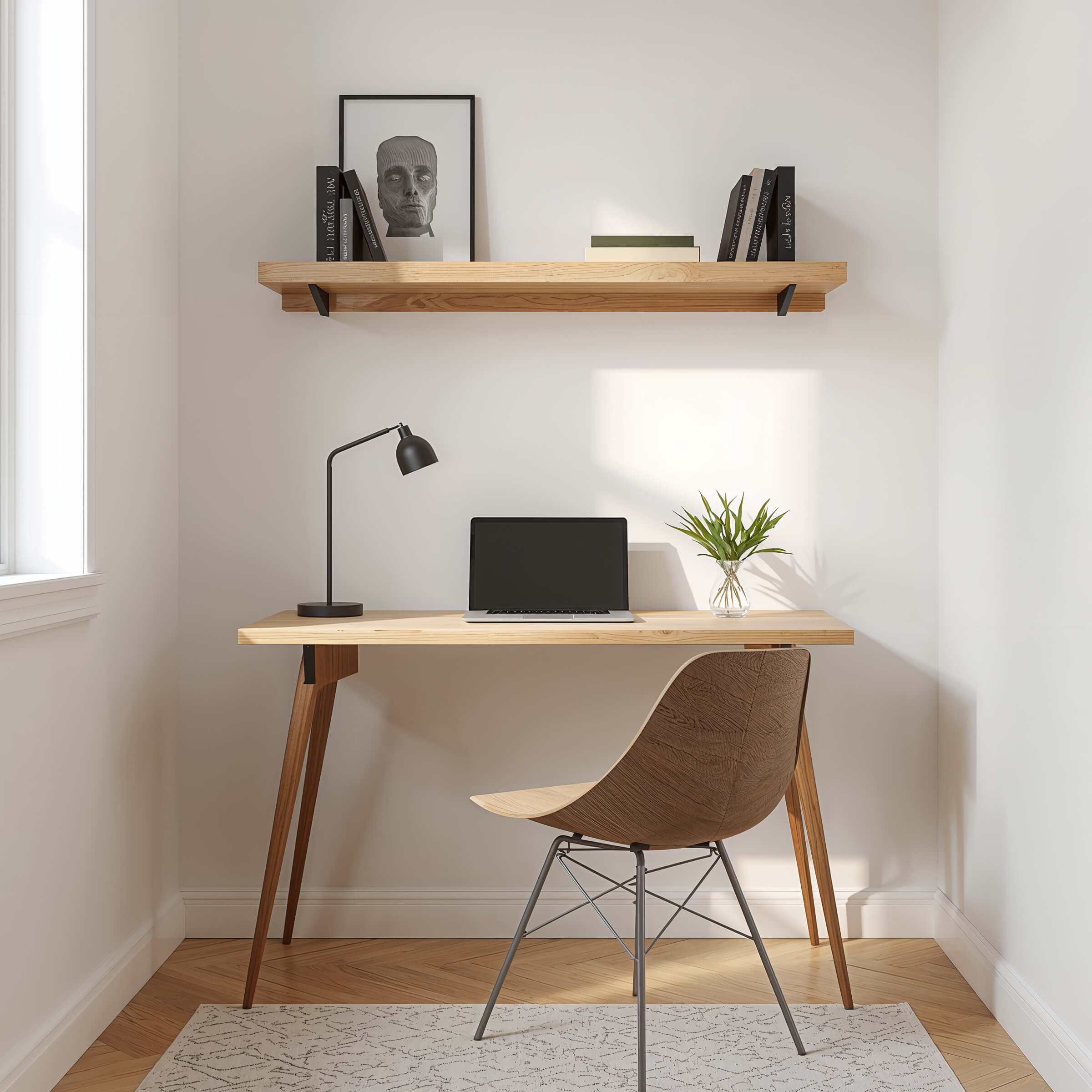 If your desk feels cramped, stop stuffing more onto the desktop. Go upward. A minimal floating shelf desk setup gives you storage without stealing any precious elbow room.