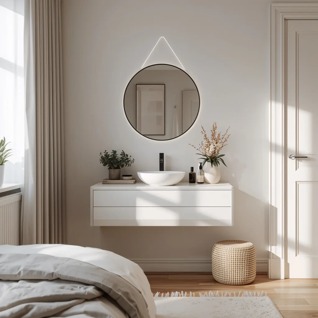 Round mirrors soften a room’s angles, and when you pair them with floating drawers, you get this gorgeous, balanced look that feels both modern and timeless. This combo has been my go-to recommendation for friends renovating.