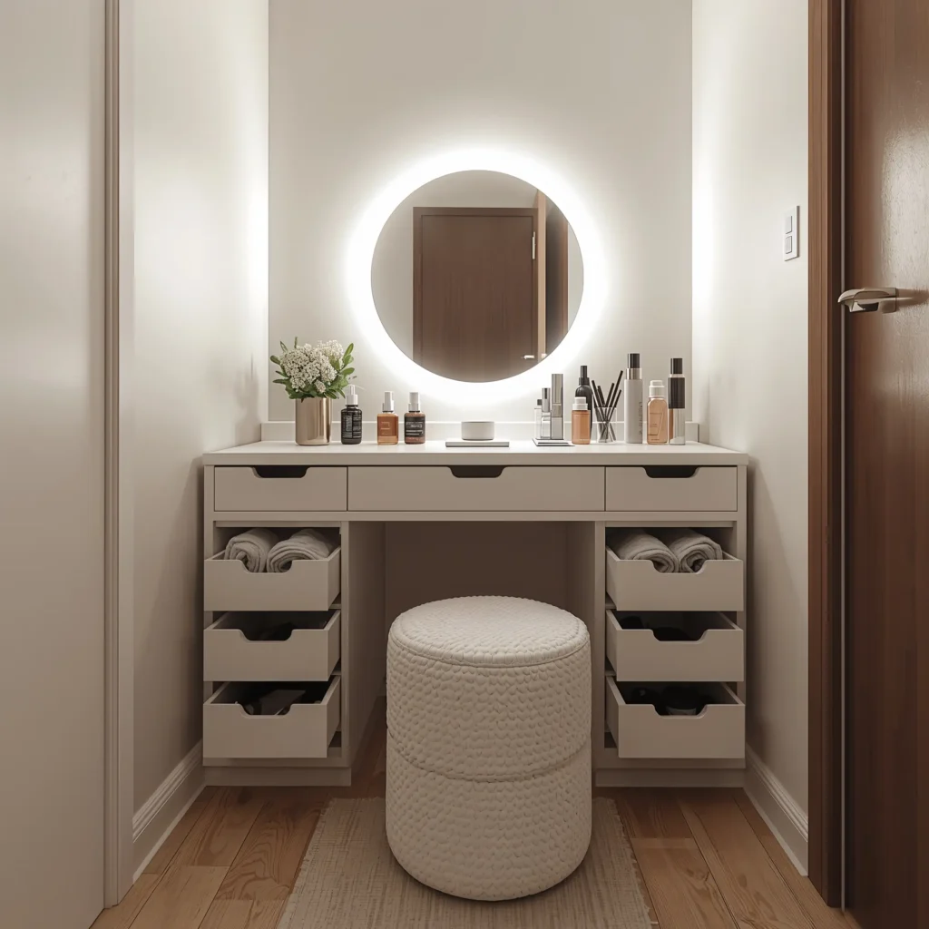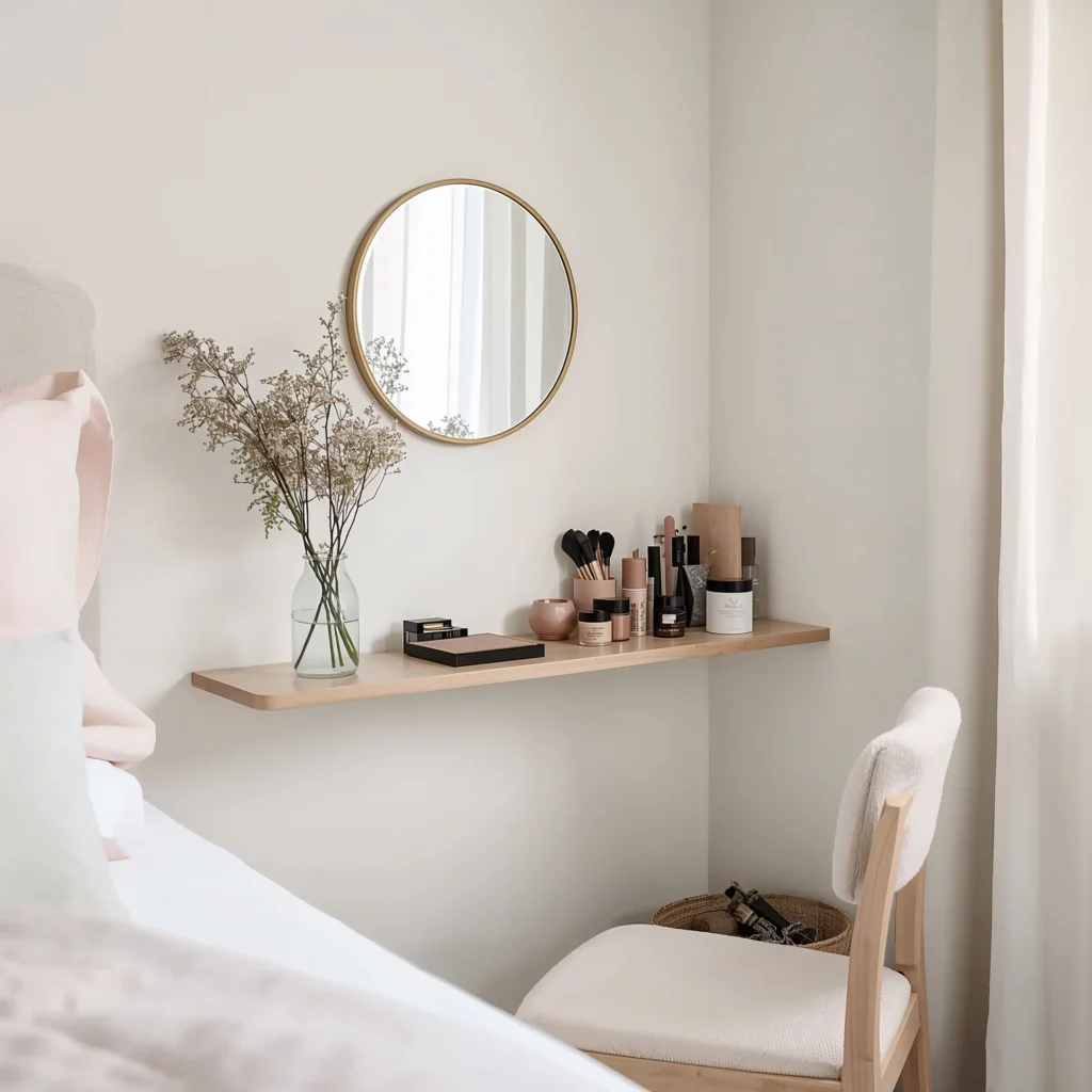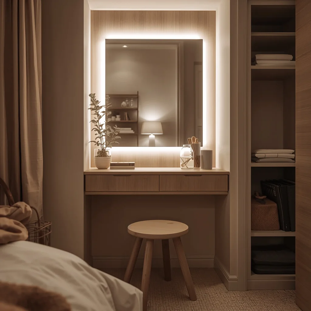 I converted my bedroom’s awkward alcove (seriously, what were the architects thinking?) into a vanity nook. Added some Hollywood-style bulbs around a mirror, installed a small floating shelf, and suddenly I had my own glam corner. The built-in lighting is a game-changer – no more doing makeup by lamplight!
