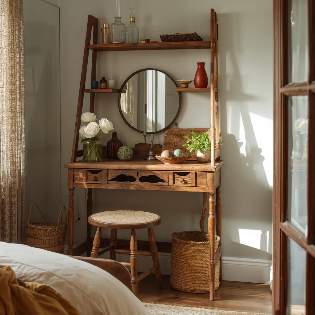 My friend transformed her grandmother’s old wooden ladder into the most enviable vanity setup. Each rung holds different items: makeup on one level, perfumes on another, towels below. The rustic vibe adds so much personality to her otherwise modern bedroom.