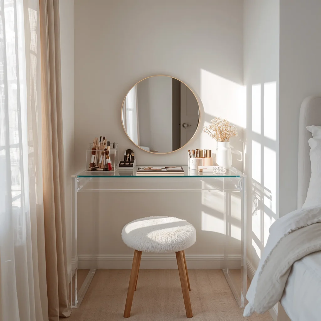 Clear acrylic vanities are having a moment, and I totally get why. They’re practically invisible, which makes your room feel bigger and airier. Plus, there’s something satisfying about seeing all your pretty products displayed like a boutique.