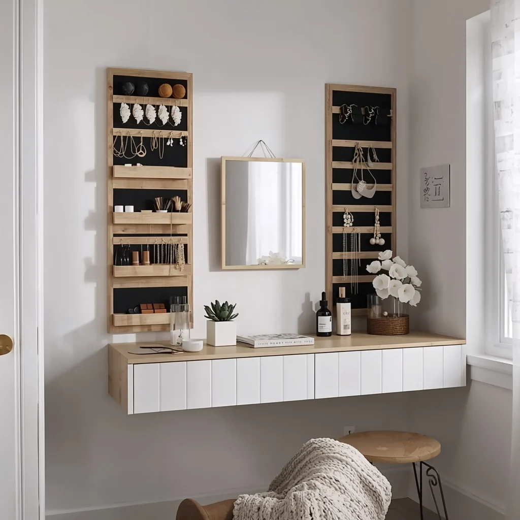 Pegboard isn’t just for garages anymore! Hanging organizer panels above or beside your vanity create customizable storage that grows with your collection.