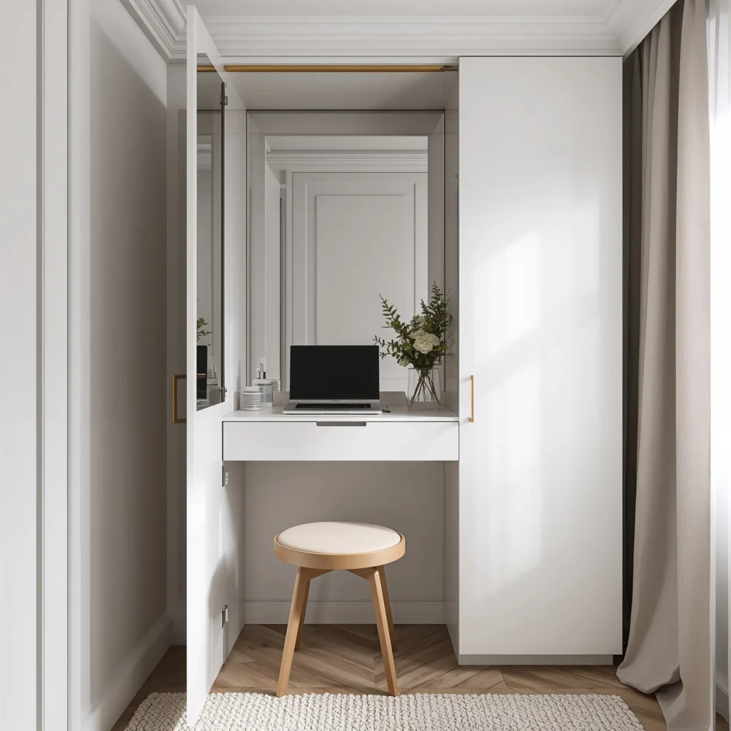 My studio apartment practically demanded this solution. During the day, it’s just a sleek panel on my wall. Come evening, I flip it down, and there’s my complete makeup station with a mirror, lights, and storage compartments. It’s like furniture origami!