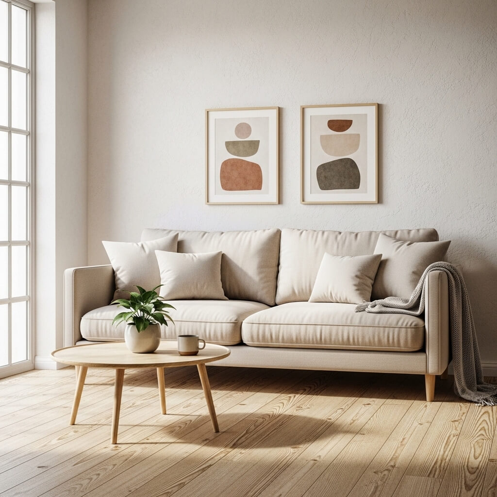 7. Scandinavian Neutral Tone Sofa Wall Styling
