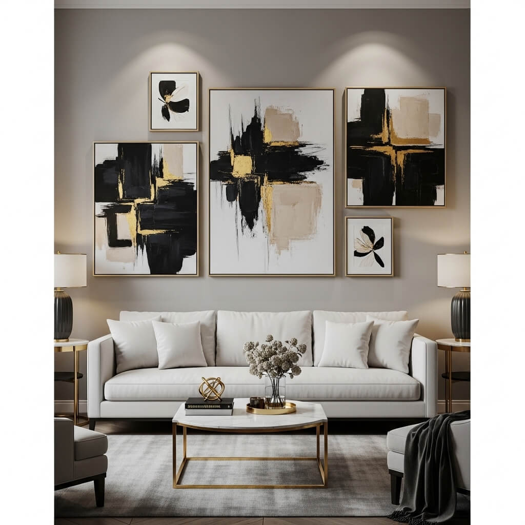 5. Abstract Art Gallery Sofa Wall Arrangement