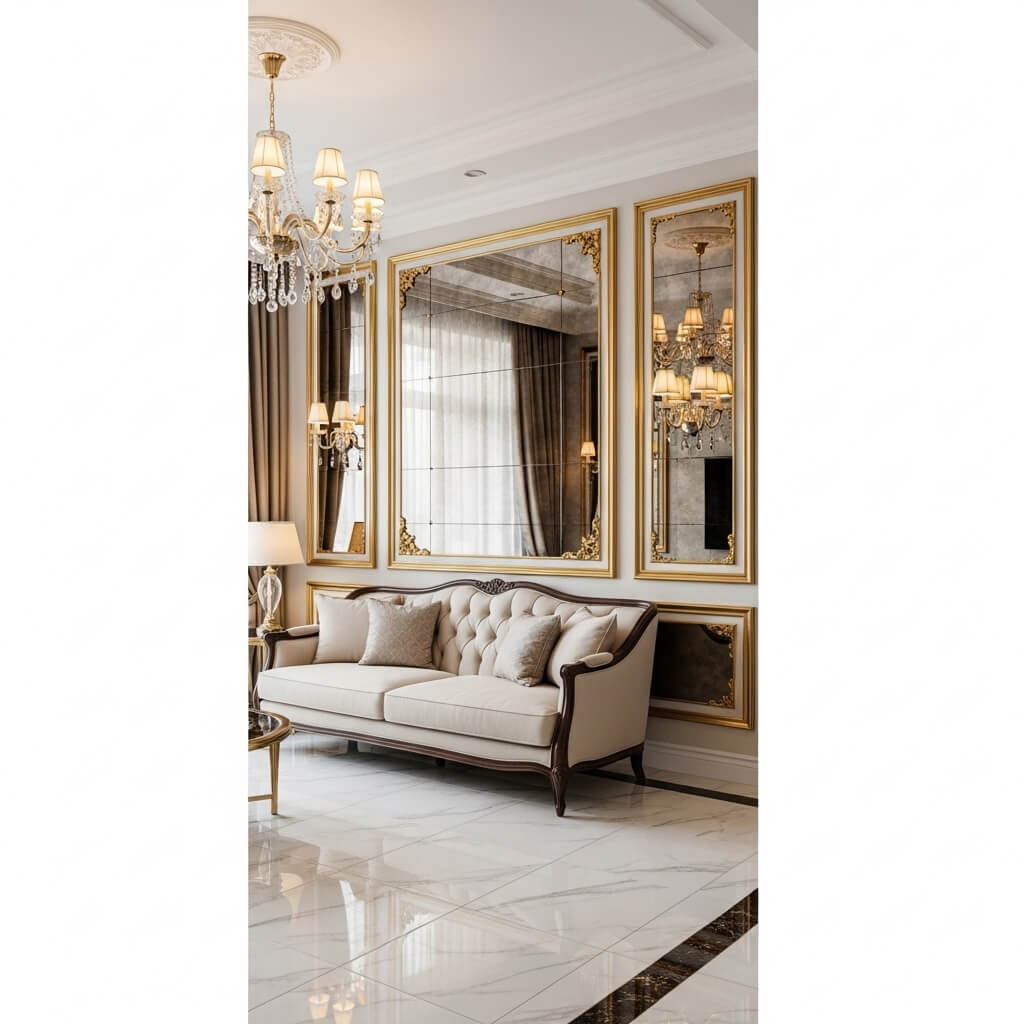 Antique-style mirrors with aged glass create a sophisticated, layered look that adds character. Or go ultra-modern with frameless mirrors arranged in a geometric pattern. Both work beautifully depending on your overall aesthetic.