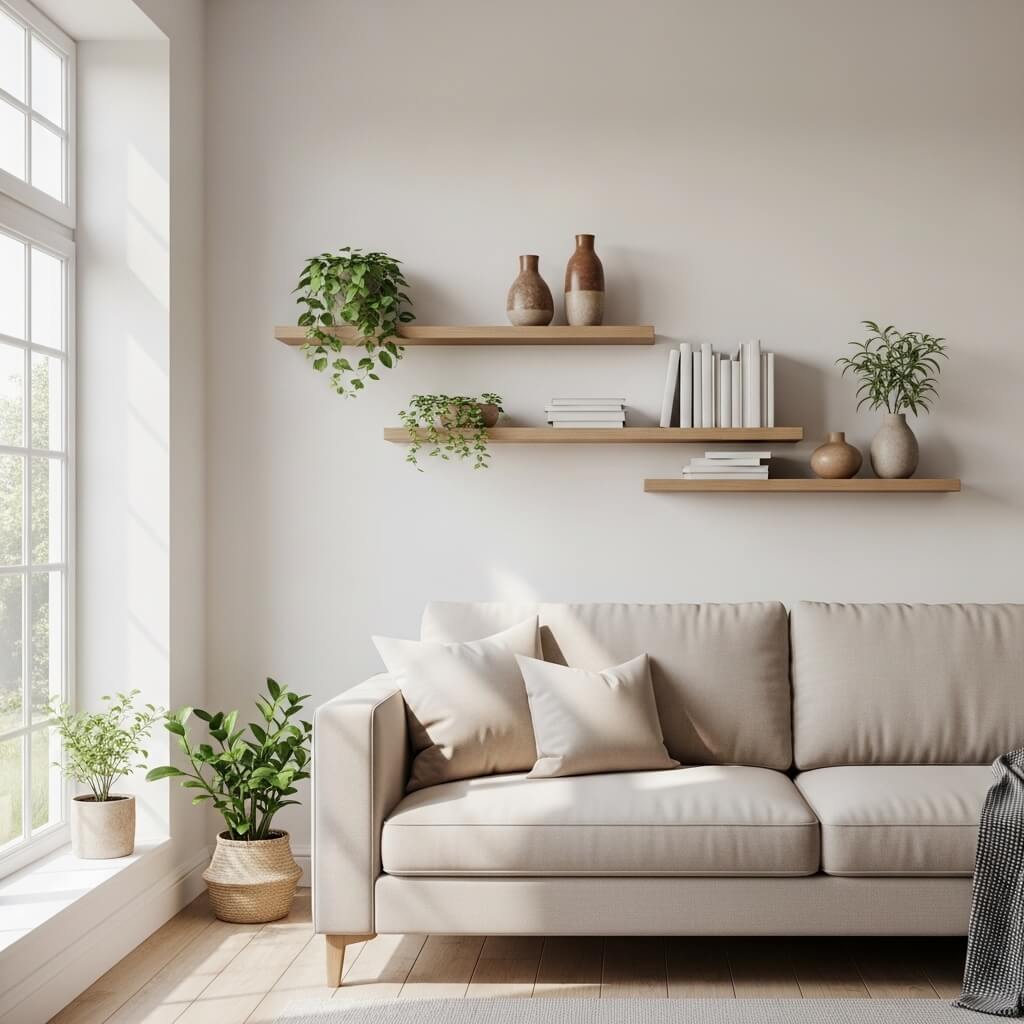 Here’s the thing about minimalism—it sounds easy until you actually try to pull it off. Floating shelves behind your sofa create this clean, intentional look that screams sophistication without trying too hard.
