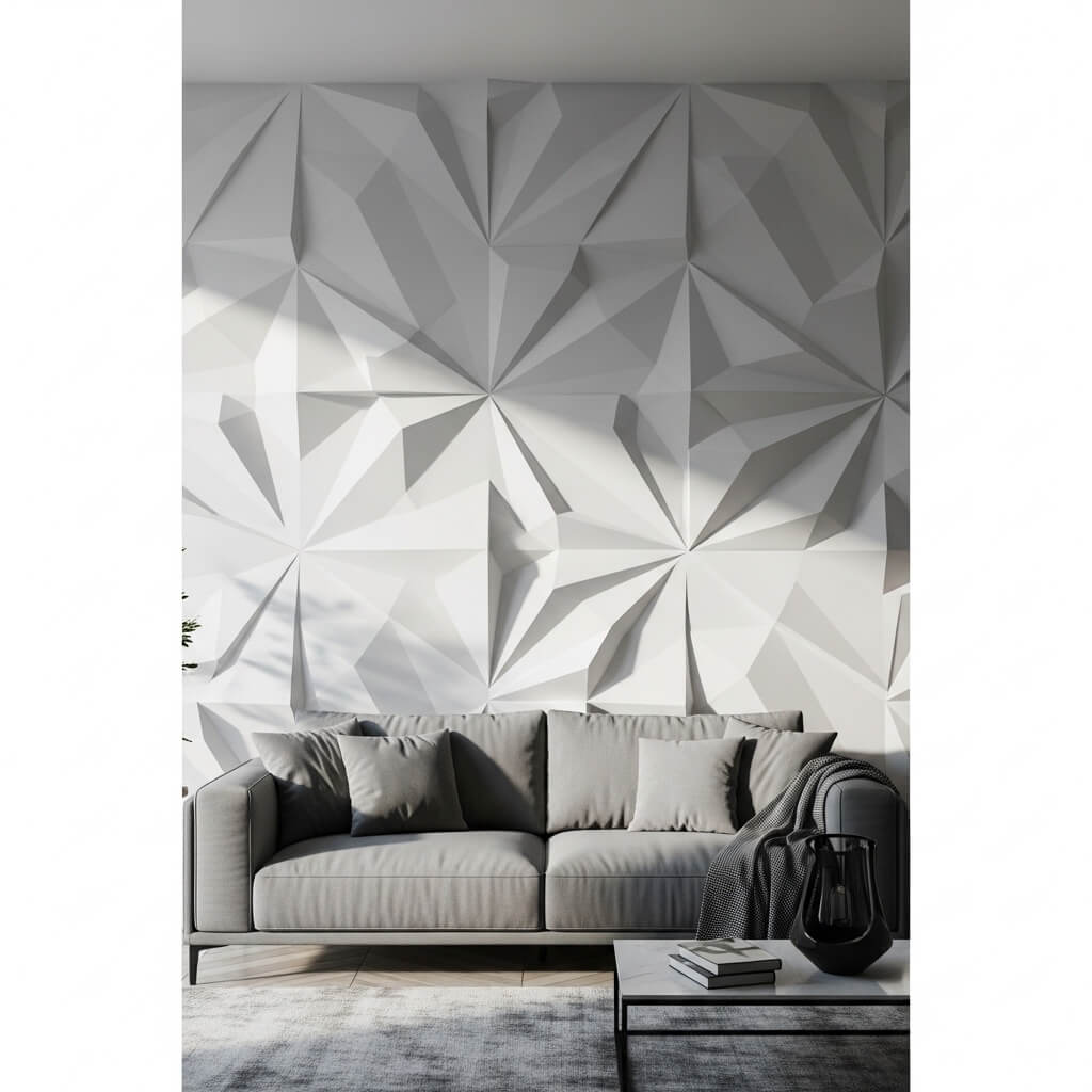 You’ve got options here: 3D wall panels (often made from PVC, MDF, or plant fiber), dimensional tiles, or even DIY wood geometric installations. I’ve seen gorgeous triangular wood installations that people created themselves for a fraction of what professional panels cost.