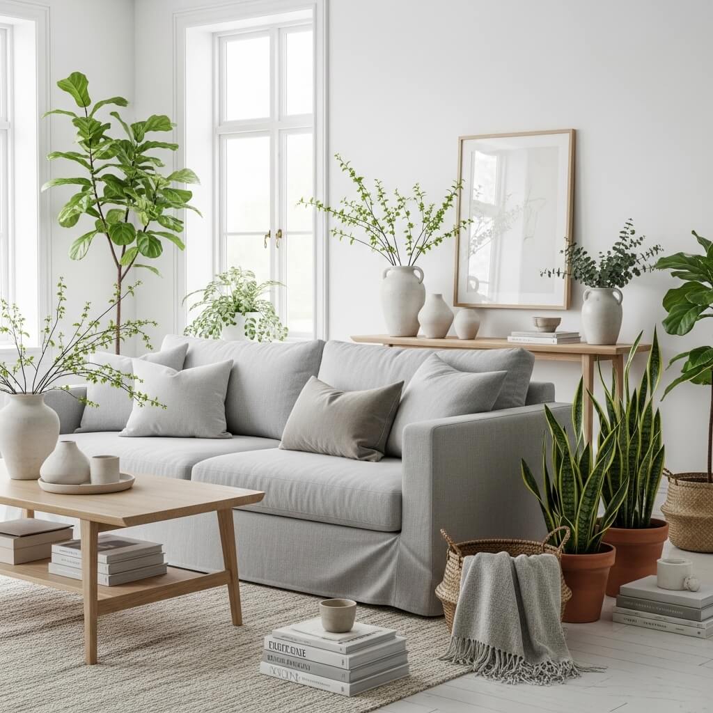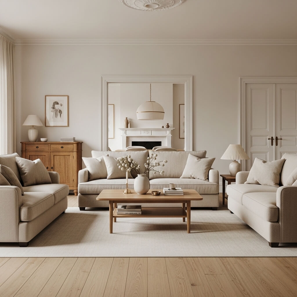 • Light, neutral upholstery in colors like soft gray, warm white, or gentle beige