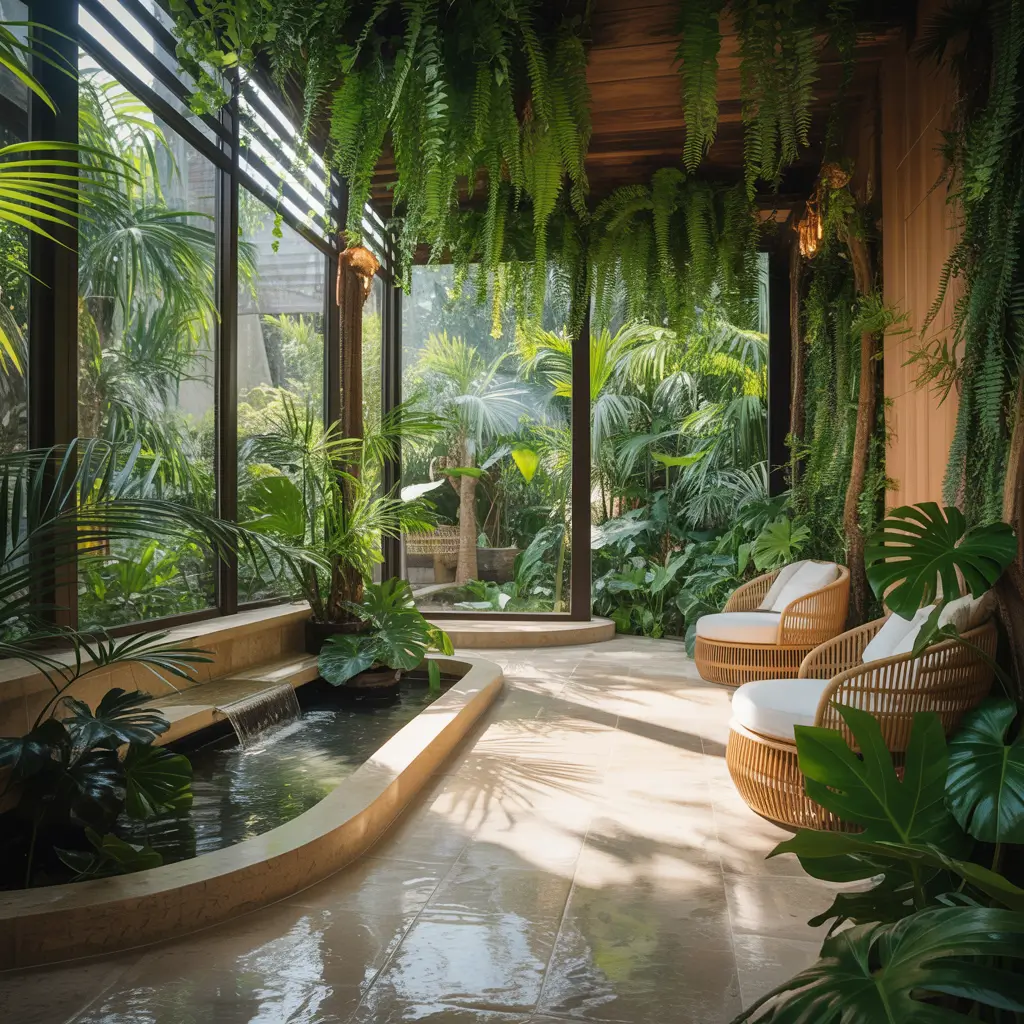 Plant life drives tropical spa design. Living walls, potted palms, hanging ferns, and tropical flowers bring the jungle indoors. These aren’t decorative additions – they’re essential elements that purify air while creating visual richness that soothes the soul.