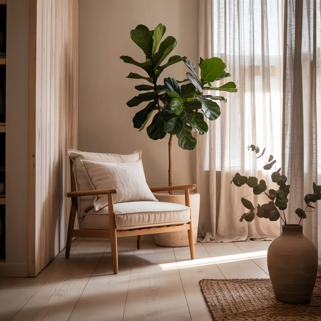 - Natural textiles in earth tones and greens