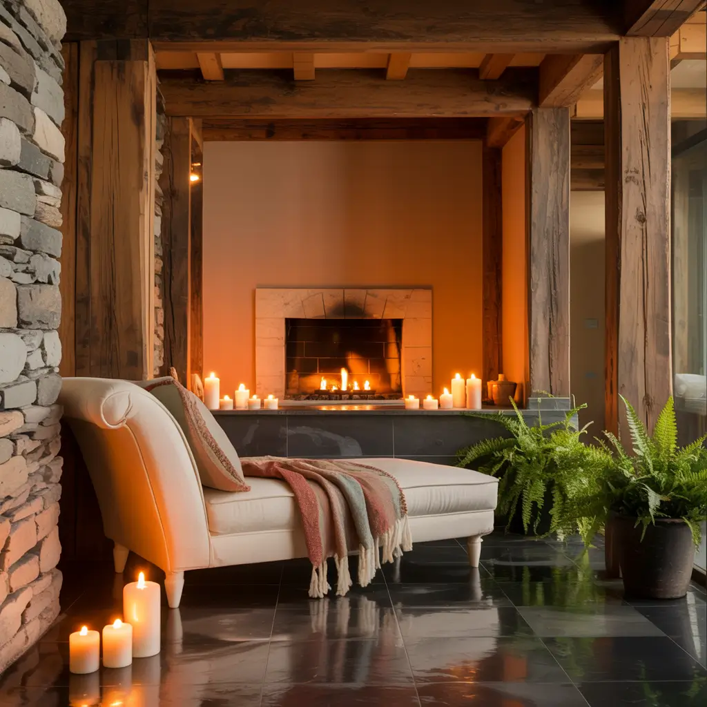 Industrial elements create urban authenticity. Exposed concrete, metal fixtures, and clean lines reference city architecture while maintaining spa serenity. The key is softening industrial hardness with comfortable textiles and warm lighting.