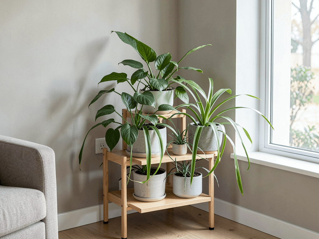 Want to feel like you own a boutique plant shop? Get yourself a tiered plant stand and load it up with spider plants at various growth stages. This creates vertical interest without taking up much floor space – perfect for small apartments or that awkward corner you don’t know what to do with.