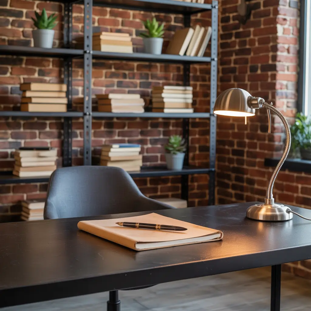 Think dark grays, matte blacks, and rich browns. I love the contrast of a heavy iron desk frame against a brick wall. It gives off a “converted warehouse loft” vibe that makes you feel like a high-powered architect or a gritty novelist.