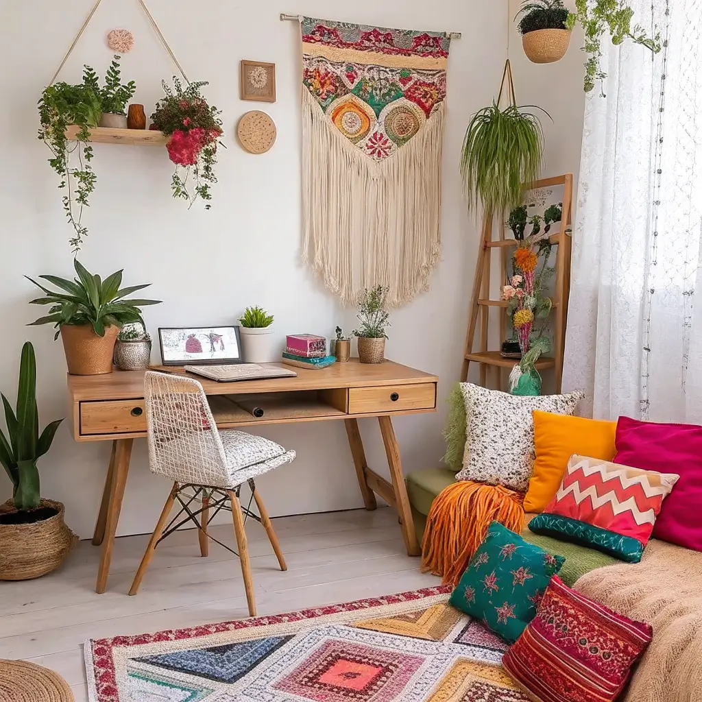 7. Boho Chic Study Area with Plants and Textiles