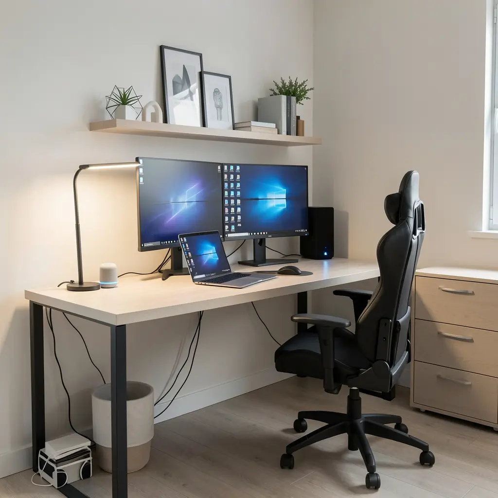 If you are a coder, a gamer, or a digital artist, you need a tech-friendly modern workspace. This design prioritizes hardware integration and high-tech aesthetics. I spent months perfecting my cable management, and let me tell you, seeing zero wires is a spiritual experience.