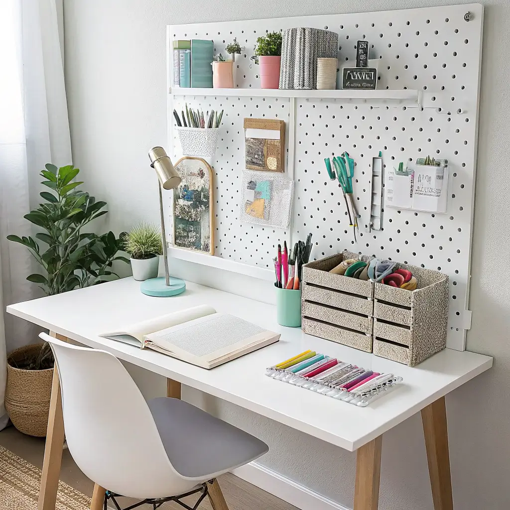 Pegboards hold all the little things that usually end up scattered across your desk. Pens, scissors, sticky notes, rulers, cables—they all get a proper home. That means more workspace and less frustration.