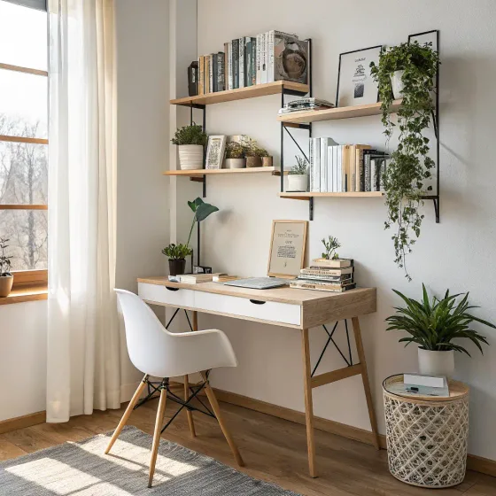 This idea works especially well for small study spaces because floating shelves don’t eat up floor space. They pull the eye upward and make the room look taller. That little visual trick works like a charm.