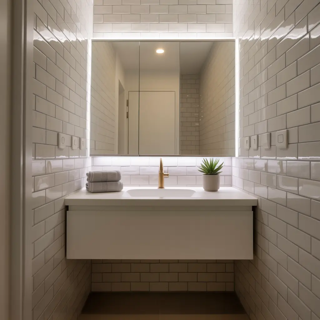 The trick is consistency. Pick one metal finish and stick with it. My brass strips tie in with the faucets, mirror frame, and light fixtures. It looks intentional rather than random.