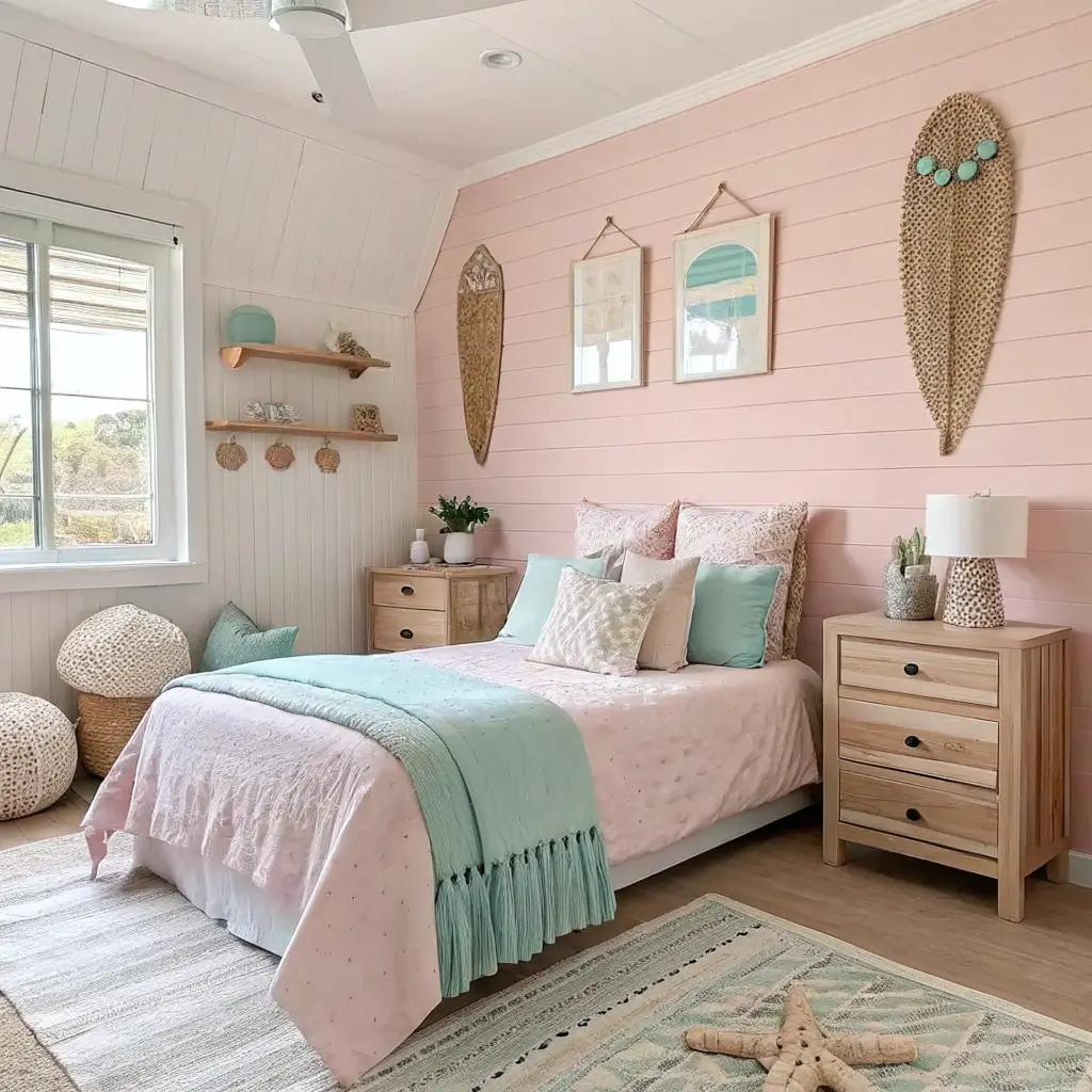 Who says surfer rooms have to be neutral or bold? The soft pastel beachy surfer bedroom brings a feminine, dreamy quality to the surf aesthetic. Think cotton candy sunsets, soft sandy shores, and gentle ocean foam.