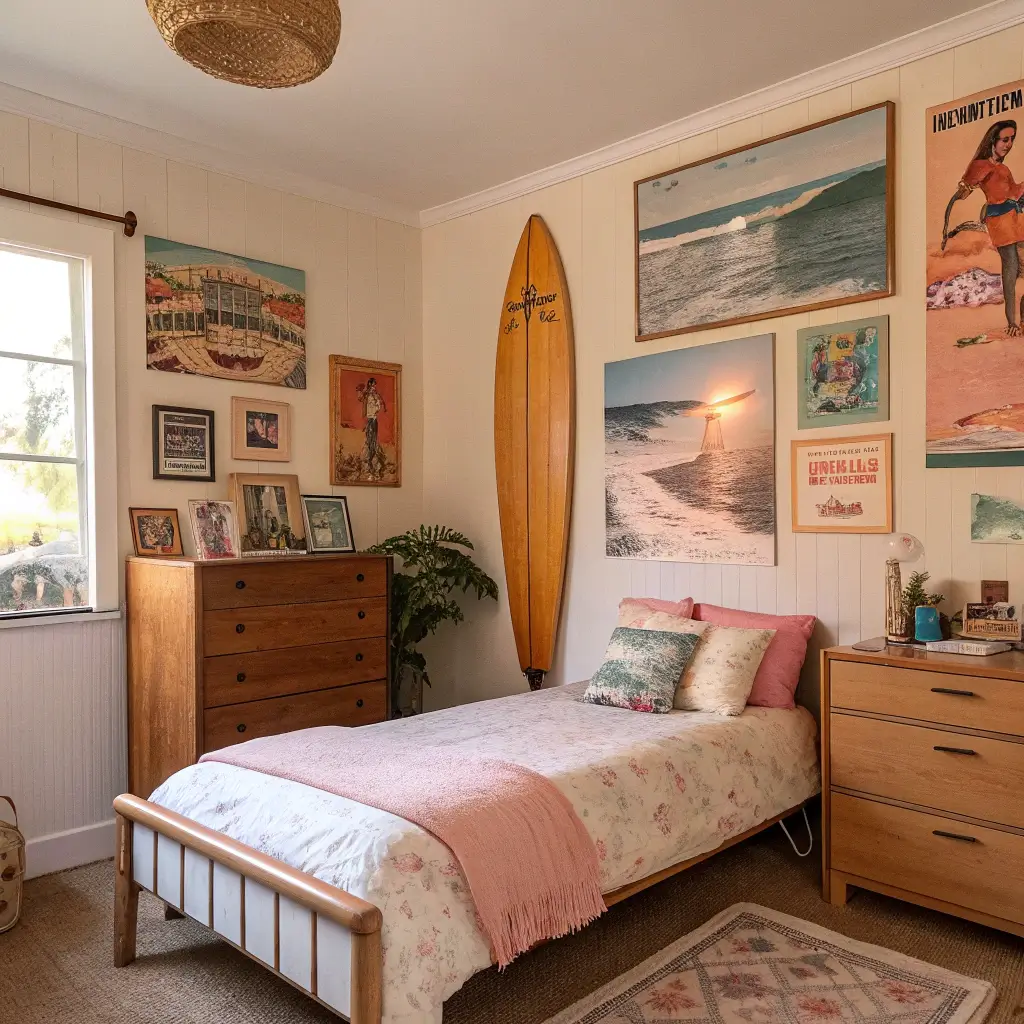 - Retro surf posters and vintage surf photography—frame them in warm wood or brass
